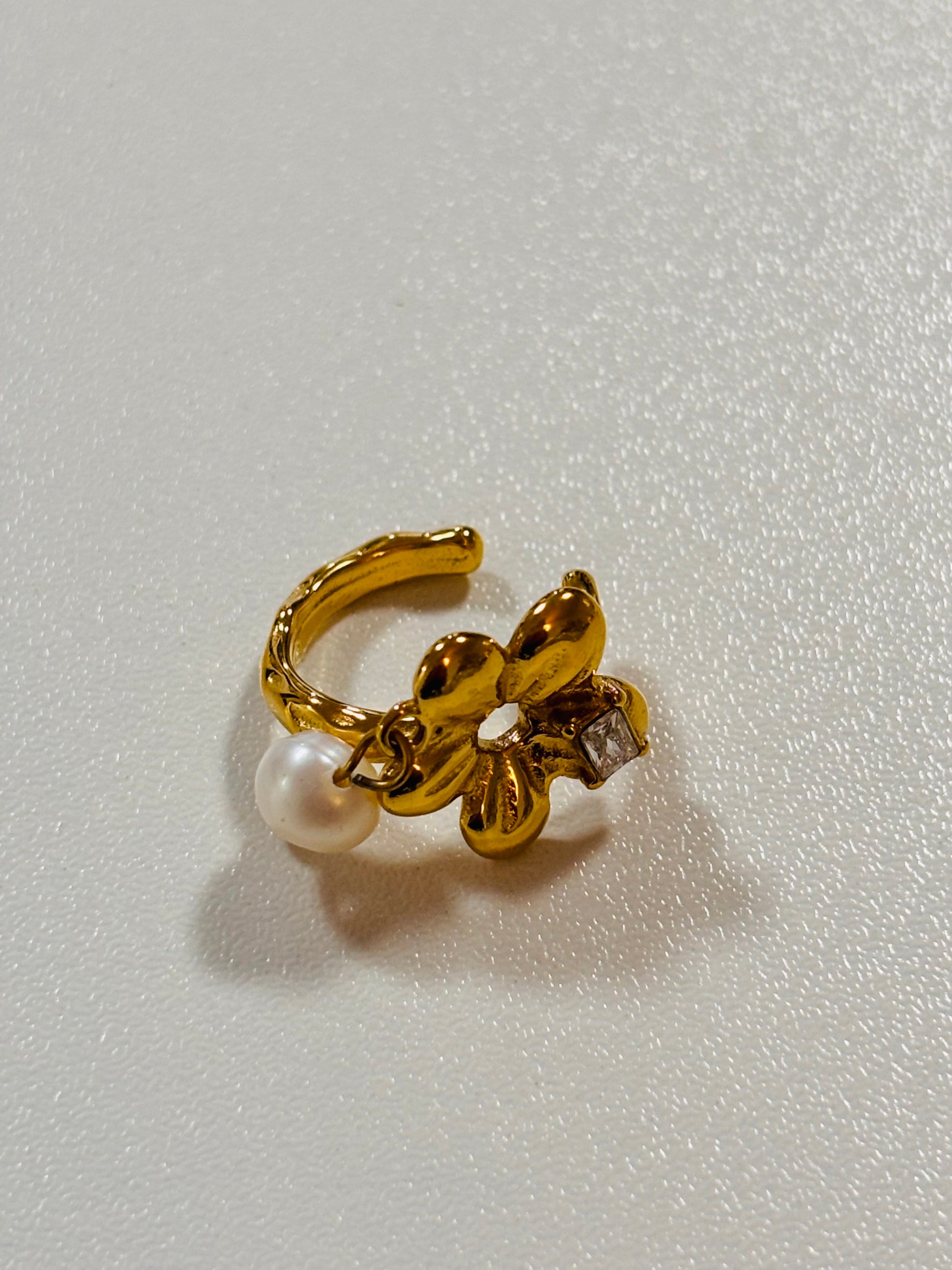 Ear cuff en oro stainless steel con detalles de flor y perlas